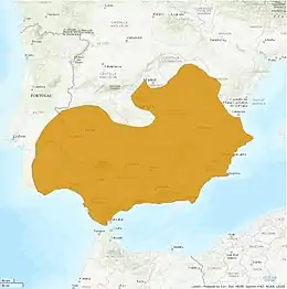 En cuanto a su extensión geográfica, no se encuentra claramente limitada.[5] Algunos expertos consideran que puede haber mayor número del que parece.[6] Han tenido lugar redescubrimientos en la provincia de Córdoba,[7] sirva de ejemplo la población hallada el municipio de Guadalcázar.[8] Las poblaciones se encuentran aisladas, lo que dificulta el intercambio genético, siendo uno de sus limitantes la ausencia de alas. También hay ciertas barreras geográficas, como la autovía A-49.[4] Se han catalogado núcleos, como manchas dispersas, lo que dificulta una aproximación de la extensión de la especie. En Andalucía se concentra la mayor extensión, sumando un total de 31 cuadrículas de un kilómetro cuadrado. En Castilla-La Mancha hay un total aproximado de cuatro cuadrículas de mismo tamaño, mientras que Extremadura y Comunidad de Madrid suman un total de tres. En los últimos años (2012) el número de poblaciones parece estar aumentando.[5]