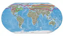 Distribución mundial aproximada del arándano rojo. Rojo: Vaccinium oxycoccus. Naranja: Vaccinium microcarpum. Verde: Vaccinium macrocarpon.
