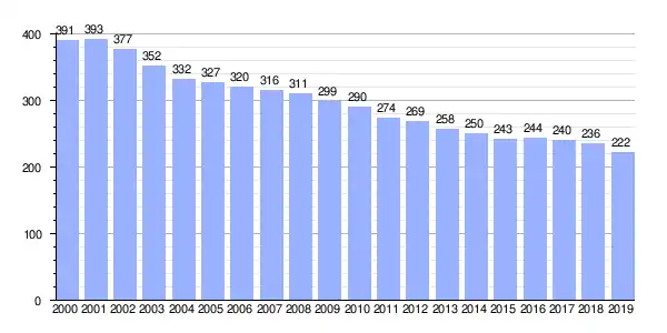 | Gráfica de evolución demográfica de Arabejo entre 2000 y 2019 |