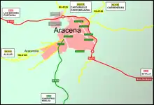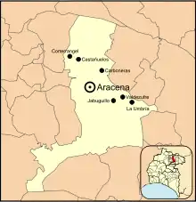 Aracena es un municipio y localidad española de la provincia de Huelva (Andalucía). Se encuentra en la serranía a la que da nombre, Sierra de Aracena, la cual forma parte de Sierra Morena, y cuenta con una población de 8240 habitantes (INE 2022)[4] y una superficie de 184,45 km².