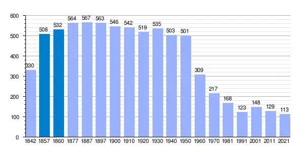 | Gráfica de evolución demográfica de Aragüés del Puerto[5] entre 1842 y 2021 |