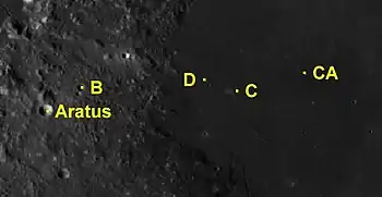 Por convención estos elementos son identificados en los mapas lunares poniendo la letra en el lado del punto medio del cráter que está más cerca de Aratus.