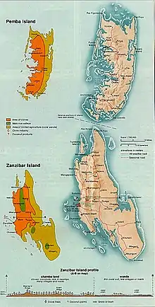 Los principales cultivos de las islas de Unguja y de Pemba son el clavo de olor (en el oeste de las islas), el arroz y coco (solo en Unguja). El este de las islas es poco propicio para la agricultura debido a la presencia de un suelo coralino poco delgado que solo permite la formación de sabana y matorrales.
