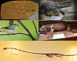 ![]() Fila 1: Sharovipteryx mirabilis y Crocodylus porosus Fila 2: Pardalotus punctatus y Hyperodapedon fischeri Fila 3: Tanystropheus longobardicus | ||