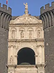 El tema del arco era la celebración de la conquista del reino por parte del rey Alfonso y del éxito de la dinastía. El friso colocado como coronación del arco de paso inferior representaba la entrada del rey en la ciudad a la manera de los antiguos emperadores romanos, sobre su carro, inspirándose en las obras análogas de la escultura romana y en la puerta de Federico II en Capua (1240), también inspirada en la idea de la soberanía imperial romana.