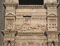El relieve del friso central del arco inferior representa el desfile triunfal de Alfonso, representado como un emperador, sentado en el carro conducido por la Fortuna y rodeado por los dignatarios de su corte. La jerarquía es reflejada mediante la colocación de las figuras del séquito en un registro inferior que el soberano. El arco superior habría debido enmarcar la estatua ecuestre del rey aragonés, que Alfonso quería que ejecutara el propio Donatello, pero que nunca se realizó. Esta estatua reconectaba la composición con la tipología del cenotafio, confirmada también por otras referencias funerarias, subrayando así el paso del soberano a un ámbito de eternidad.