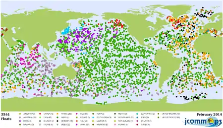 El programa Argo es una colaboración entre 50 agencias de investigación y operacionales de 26 países, con Estados Unidos que aportan más de la mitad de la financiación total. Argo es una parte del Sistema Integrado de Observación de los Océanos.