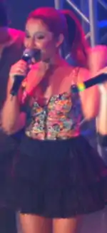 Ariana Grande-Butera (Boca Ratón, Florida, 26 de junio de 1993)[2] es una cantante, actriz y empresaria estadounidense.[3] Comenzó su carrera musical en Broadway a los 15 años en el musical 13 (2008). Saltó a la fama por interpretar a Cat Valentine en las series de televisión de Nickelodeon Victorious (2010-2013) y Sam & Cat (2013-2014). Grande firmó con Republic Records en 2011 después de que los ejecutivos del sello vieran vídeos de YouTube de sus versiones de canciones. Su álbum debut de pop y R&B influenciado por el doo wop de la década de 1950,[4]Yours Truly (2013), encabezó el Billboard 200 de Estados Unidos, mientras que su sencillo principal, «The Way», llegó al top 10 del Billboard Hot 100 de Estados Unidos. La voz y el registro de silbidos de Grande en el álbum generaron comparaciones inmediatas con Mariah Carey. [cita requerida]