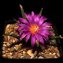 Cacto verde oscuro a pardo, semienterrado bajo la tierra, de 3-8 cm de diámetro. Tubérculos que se proyectan de la base del tallo, divergiendo, de 2-5 cm de largo y 0,5-1 cm de ancho. Las areolas están cerca de las puntas del tubérculo, ocasionalmente con pequeñas espinas. Flores rojo magenta de 4 cm de diámetro. El fruto es redondeado, rojizo púrpura, castaño a la madurez, de 1 cm de largo.