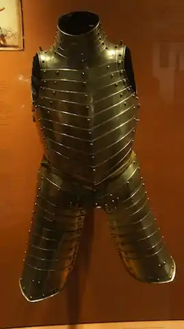 La armadura está compuesta por láminas de acero superpuestas que son sostenidas por correas internas de cuero y remaches corredizos. Este diseño de armadura de influencia italiana encontrado en el peto y en el contraplato es conocido como anima. Kirkener diseñó animas entre 1550 y 1560. La pieza del ROM es una de las tres únicas animas sobrevivientes hechas en Greenwich que se encuentran en colecciones públicas.[2]