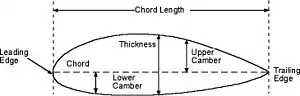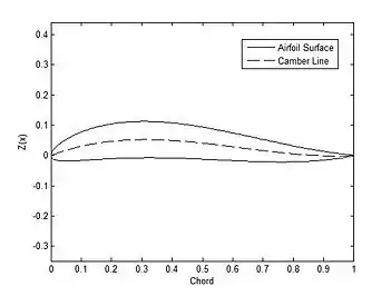 Se dice que un perfil aerodinámico tiene un camber positivo si su superficie superior (o en el caso de una turbina o pala de hélice, su superficie delantera) es la más convexa. La curvatura es una propiedad compleja que puede caracterizarse de forma más completa mediante la línea de curvatura de un perfil aerodinámico, la curva Z(x) que se encuentra a medio camino entre las superficies superior e inferior, y la función de espesor T(x), que describe el espesor del perfil aerodinámico en un punto determinado. Las superficies superior e inferior pueden definirse como sigue: