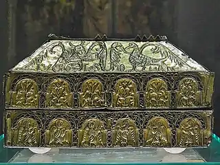 El alma de la arqueta es de madera, y está recubierta por cinco placas de plata repujada y sobredorada. La arqueta tiene forma de prisma rectangular, y se abre por la mitad. En los laterales exteriores de la arqueta aparecen dos niveles, divididos por la apertura que separa la tapa de la caja, en los que se encuentran sendas arquerías de medio punto rebajado, semejantes a los que aparecen en la iglesia de San Miguel de Lillo, y las roscas, apoyos y enjutas están decoradas con vidrios tabicados de colores verde, rojo o azul, de distintas formas y tamaños.[2] En la arquería superior, que corresponde a la tapa del arca, aparecen representados árboles estilizados en el interior de los arcos, que cobijan a aquellos. En el nivel inferior de la arquería, que corresponde a la caja de la arqueta, aparecen catorce ángeles con las alas plegadas, dispuestos de frente o de perfil, con el brazo derecho o el izquierdo alzado, y todos ellos en actitud de oración y de alabanza.