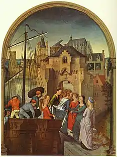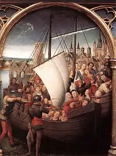 Dos barcos en primer plano, donde viajan Santa Úrsula, su marido y Cyriacus Papa con sus prelados. También aparecen algunas de las vírgenes partiendo en un barco.