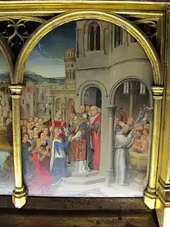 En los laterales, bajo pequeñas arquerías, hay seis escenas del viaje y martirio de Santa Úrsula, que recuerdan el estilo de las vidrieras de la época. Los temas son: