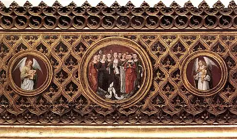 La cubierta, que simula un tejado muy inclinado, como los típicos del norte de Europa, incluye tres tondos pintados a cada lado. Están atribuidos no a Memling directamente, sino a su taller. Sus temas son, a un lado Las primeras once vírgenes con el Papa, un cardenal, un obispo y Etherius; al otro lado, La coronación de la Virgen con la Santísima Trinidad.