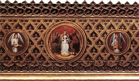 En los cuatro pequeños medallones que flanquean las dos escenas, el artista ha colocado a unos ángeles que tocan diversos instrumentos.