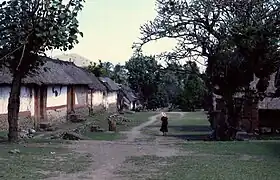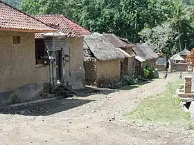 La segunda diferencia es el diseño de cada complejo de casa. Los pabellones balineses de las tierras bajas rodean un patio central (natah). En el complejo de casas Bali Aga, cada casa (umah) está dispuesta en una línea a lo largo de un eje cuesta arriba-cuesta abajo, como casas en hilera frente a un corredor central. Una sola fila de casas indica un complejo establecido por un antepasado masculino. A veces hay dos hileras paralelas de casas, que son evidencia de haber tenido más de un fundador, generalmente un grupo de hermanos o cuñados. Todas las entradas de las casas miran hacia adentro, hacia el corredor central.[2]