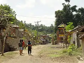El diseño de las villas rurales Bali Aga es similar al de los pueblos balineses de las tierras bajas. Los pueblos están dispuestos en relación con el eje montaña-mar del kaja ('mirando hacia la montaña') al kelod ('mirando hacia el mar'), y los 'movimiento' del sol desde el kangin (donde sale el sol, el este) al kauh (donde se pone el sol, oeste). El conjunto de casas está dispuesto en un eje kaja-kelod, frente a una gran avenida. Cada complejo de casas (llamado banjaran o pekarangan) está rodeado por un muro o cerca de tierra. Estos complejos de casas contienen casas pertenecientes a una familia ampliada.[1]