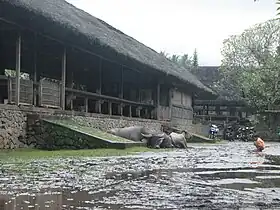 El corazón de un pueblo Bali Aga es la casa comunal de la comunidad llamada bale lantang (también bale agung: 'gran salón' o bale banjar: 'salón del pueblo'), el edificio sagrado del consejo.[2] La estructura está construida sobre una base de ladrillo y está orientada longitudinalmente sobre un eje cuesta arriba-cuesta abajo. Las reuniones del consejo del pueblo se llevan a cabo en un bale lantang, que tiene lugar cada luna nueva y luna llena. Los cabezas de familia se reúnen y toman sus lugares en el bale lantang según un estricto orden de estatus social, que les obliga a sentarse en dos filas paralelas según su antigüedad. Los miembros más mayoress siempre están al final de la cuesta arriba (kaja) en el lado del kangin (amanecer).[1]
