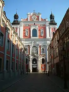 En los primeros años del siglo XVII, la arquitectura barroca se difundió por la Mancomunidad. Algunas tempranas iglesias barrocas fueron la capilla Vasa en la catedral de Wawel (que era el equivalente barroco de la vecina capilla de Segismundo, construida años antes en estilo renacentista) y la Iglesia de la Visitación de Cracovia. La mayoría de esas tempranas iglesias siguieron un patrón establecido por la iglesia del Gesù de Giacomo Barozzi da Vignola en Roma.[3] Otras iglesias y capillas de mediados del siglo XVII fueron la capilla de San Casimiro en la catedral de Vilnius,[4] la Iglesia de San Pedro y San Pablo y la Iglesia de San Casimiro en Vilnius, el monasterio de Pažaislis en Kaunas, la Iglesia de los Dominicos[5] y la Iglesia de San Jorge en Lwów (actual Lviv, ahora Ucrania). Ejemplos de finales del XVII son la iglesia de los jesuitas en Poznań, la catedral de San Francisco Javier en Grodno, la capilla Real en Gdańsk (de un estilo arquitectónico ecléctico basado en una mezcla de tradiciones constructivas polacas y neerlandesas),[6] y el santuario de Santa María en Masuria (construido en estilo barroco tirolés).[7] Ejemplos notables de arquitectura barroca residencial de este período son el castillo de Ujazdów, el palacio de Wilanów y el palacio Krasiński (1677-1683) en Varsovia.