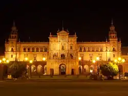 La Plaza de España de Sevilla configura uno de los espacios abiertos más grande de la arquitectura regionalista. Fue encargada su construcción al arquitecto Aníbal González , para la Exposición Iberoamericana del año 1929. Dicha exposición fue inaugurada desde la plaza por Alfonso XIII.[8]