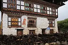 Como ocurre con la mayoría de los edificios, las casas comunes en la zona occidental presentan paredes de tierra apisonada, machacadas en marcos de madera durante una semana y enlucidas con cal. Una vez terminadas, pueden dejarse con el pigmento natural o bien pueden blanquearse.[6][7] Por otra parte, los valles orientales más húmedos de Bután tienden a ser barrancos estrechos y empinados, con asentamientos excavados directamente en las laderas de las montañas;[9] en estas regiones, los muros están hechos con mayor frecuencia de piedra.[6][10]