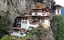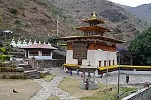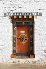 Los templos budistas (lhakhang) en Bután son a menudo estructuras relativamente simples de un solo piso que rodean un patio. Es común que una franja roja decore los edificios a lo largo de las paredes superiores y que los techos presenten colores dorados.[7]