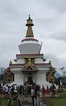 Otra estructura religiosa típica del reino son los chörtens, receptáculos de adoración similares a las estupas. Los chörten abovedados butaneses más grandes están tallados en piedra y presentan un encalado al estilo nepalí. En el este y el centro de Bután se encuentran chörtens acampanados más pequeños, a menudo acompañados de una superestructura protectora de madera. El estilo nativo de Bután es un pilar de piedra cuadrado con un khemar cerca de la parte superior, a veces acompañado de una bola y una media luna para representar el sol y la luna. Esta tipología autóctona representa una especie de forma reducida de la estupa clásica.[7]