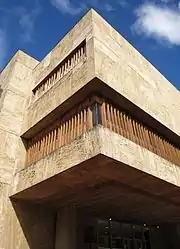 Esquina suroriental de la Biblioteca Luis Ángel Arango diseñada por Germán Samper Gnecco.