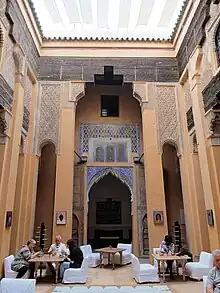 Comenzando con los saadíes y continuando con los alauitas (sus sucesores y la monarquía reinante en la actualidad), los eruditos modernos (occidentales) describen el arte y la arquitectura marroquíes como esencialmente "conservadores"; lo que significa que continuó reproduciendo el estilo existente con alta fidelidad, pero no introdujo innovaciones importantes.[1][35][38] [36][2] Los saadíes, especialmente bajo los sultanes Abdallah al-Ghalib y Ahmad al-Mansur, fueron grandes constructores y se beneficiaron de grandes recursos económicos en el apogeo de su poder a finales del siglo XVI. Además de las Tumbas Saadíes, también construyeron la madrasa de Ben Youssef y varias mezquitas importantes en Marrakech, incluidas la Mezquita Mouassine y la Mezquita Bab Doukkala. Estas dos mezquitas se destacan por ser parte de complejos caritativos de usos múltiples más grandes que incluyen varias otras estructuras como fuentes públicas, baños turco, madrasas y bibliotecas. Esto marcó un cambio con respecto a los patrones anteriores de mecenazgo arquitectónico y puede haber sido influenciado por la tradición de construir tales complejos en la arquitectura mameluca en Egipto y los külliye de la arquitectura otomana.[35] [32] Los saadíes también reconstruyeron el complejo del palacio real en la Qasba de Marrakech, donde Ahmad al-Mansur construyó el famoso Palacio El Badi (construido entre 1578 y 1593), conocido por su decoración superlativa y sus costosos materiales de construcción, incluido el mármol italiano.[35] [32]