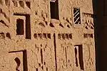 Estructuras como los agadirs (graneros fortificados) y ksar (pueblos fortificados; a menudo escritos ksour en plural) son características tradicionales destacadas de la arquitectura bereber en Marruecos.[85] Asimismo, los paisajes de las montañas del Atlas y las regiones de oasis de Marruecos están marcados por numerosas qasbas –o tighremt en lenguas bereberes [83] – que en este caso se refiere a estructuras altas y fortificadas que actúan como fuertes, almacenes y/o residencias fortificadas.[84] [7] Estos, a su vez, pueden estar decorados con motivos geométricos locales tallados en los exteriores de adobe.[84] [7]
