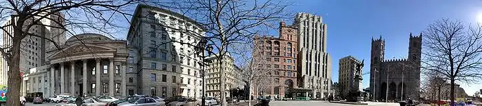 La Place d'Armes está rodeada por edificios que representan varios períodos diferentes en la arquitectura de Montreal: la neogótica Basílica de Notre-Dame; el New York Life Building, primer rascacielos de Montreal; la sede del Bank of Montreal, primer banco de Canadá y similar al Panteón de Roma, el ya mencionado Aldred Building[1] (1931) y el 500 Place D'Armes, de Estilo Internacional.[2]