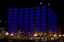 - Embarcadero Center, San Francisco (1971-1973): Los edificios se iluminan cada año en verde y rojo durante las vacaciones de Navidad / Hanukkah , entre el día posterior al Día de Acción de Gracias y la Epifanía .