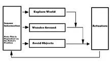 La arquitectura de subsunción es una arquitectura de control que se propuso en oposición a la IA tradicional o GOFAI . En lugar de guiar el comportamiento mediante representaciones mentales simbólicas del mundo, la arquitectura de subsunción acopla la información sensorial con la selección de acciones de una manera íntima y de abajo hacia arriba .[3] : 130 Lo hace descomponiendo el comportamiento completo en subcomportamientos. Estos subcomportamientos están organizados en una jerarquía de capas. Cada capa implementa un nivel particular de competencia conductual, y los niveles superiores pueden subsumir los niveles inferiores (= integrar/combinar los niveles inferiores en un todo más completo) para crear un comportamiento viable. Por ejemplo, la capa más baja de un robot podría ser "evitar un objeto". La segunda capa sería "deambular", que se encuentra debajo de la tercera capa "explorar el mundo". Debido a que un robot debe tener la capacidad de "evitar objetos" para "deambular" de manera efectiva, la arquitectura de subsunción crea un sistema en el que las capas superiores utilizan las competencias de nivel inferior. Las capas, que reciben información de sensores, funcionan en paralelo y generan salidas. Estas salidas pueden ser comandos para actuadores o señales que suprimen o inhiben otras capas. : 8–12, 15–16