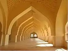 El sultanato bahmaní en Decán se separó de los tughlaq en 1347 y gobernó desde Gulbarga, Karnataka y luego Bidar hasta que los mogoles lo invadieron en 1527. La mezquita principal (1367) en el gran fuerte o ciudadela de Gulbarga tiene la particularidad de no tener patio. Hay un total de 75 cúpulas, todas pequeñas y poco profundas excepto una grande sobre el mihrab y cuatro más pequeñas en las esquinas. El gran interior tiene un espacio hipóstilo central y pasillos anchos con arcos "transversales" que surgen desde una altura inusualmente baja (ilustrado). Este rasgo distintivo se encuentra en otros edificios bahmaníes y probablemente refleja la influencia iraní, que se ve en otros elementos como una planta de cuatro iwanes y azulejos vidriados, algunos importados de Irán, utilizados en otros lugares. Se dice que el arquitecto de la mezquita era persa.[22]