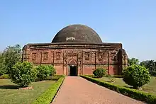 El sultanato de Bengala (1352-1576) normalmente utilizaba ladrillo como material de construcción principal de grandes edificios, como lo habían hecho en los edificios preislámicos.[24] La piedra tuvo que importarse en mayor parte de Bengala, mientras que la arcilla para ladrillos abundaba. La piedra se utilizó para columnas y detalles destacados, generalmente reutilizada de templos hindúes o budistas.[25] El mausoleo Eklakhi de principios del siglo XV en Pandua, Malda o Adina, a menudo se considera el edificio islámico cuadrado de una sola cúpula más antiguo que se conserva en Bengala, la forma estándar de mezquitas y mausoleos más pequeños. Pero hay una pequeña mezquita en Molla Simla, distrito de Hugli, que posiblemente sea de 1375, o sea anterior al mausoleo.[26] El mausoleo de Eklakhi es grande y tiene varias características que se volverían comunes en el estilo bengalí, incluida una cornisa ligeramente curvada, grandes contrafuertes decorativos redondos en las esquinas y decoración en ladrillo de terracota tallada.[27] Estas características también se ven en la mezquita Choto Sona (alrededor de 1500), que es de piedra, inusualmente en Bengala, pero comparte el estilo y mezcla cúpulas y un techo curvo de "arroz" basado en los techos de las casas de pueblo hechos de paja vegetal. Estos techos aparecen aún con más fuerza en la arquitectura posterior de los templos hinduistas de Bengala, con tipos como el do-chala, el jor-bangla y el char-chala.[28] Para las mezquitas más grandes, los arquitectos bengalíes multiplicaron el número de cúpulas, siendo una opción una fórmula de nueve cúpulas (tres filas de tres), que sobrevivió en cuatro ejemplos, todos del siglo XV o XVI y ahora en Bangladés,[29] aunque había otros. con mayor número de cúpulas.[30]