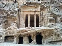 En Petra, hay una serie de tumbas llamadas «Tumbas Reales», que se dividen en cuatro secciones: la tumba de la Urna, la tumba de Seda, la tumba de Corinto y la tumba de Palacio. La tumba de la Urna está construida en lo alto de la ladera de la montaña y requiere subir varios tramos de escaleras. Se ha sugerido que sería la tumba del rey nabateo Malco II, que murió en el año 70 a. C.. Al lado está la tumba de Seda, llamada así por el rico color de la piedra arenisca. La tumba de Corinto es la siguiente, con columnas corintias griegas. Finalmente, la tumba de Palacio con tres pisos bien diferenciados en su fachada.[44]