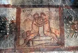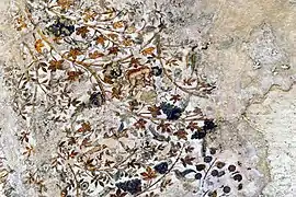 Las pinturas murales del Biclinio Pintado se pueden agrupar en dos grandes escenas. La cámara mayor tiene el muro meridional decorado con estuco, creando falsos elementos arquitectónicos que recuerdan a algunas pinturas murales pompeyanas. La habitación interior tiene una decoración pintada en un estilo completamente diferente al de la habitación exterior mayor. En lugar de adornos arquitectónicos, las paredes y el techo abovedado de esta sala muestran un programa complejo de enredaderas, flores, figuras, diversas variedades de aves locales e insectos entrelazados. Varios erotes —pequeños dioses alados asociados con el amor y ocasionalmente con el cultivo del vino— se ven participando en el manejo de la viticultura, usando escalas y podaderas, cargando canastas de uvas recolectadas y defendiendo las vides de las aves carroñeras. Los erotes están armados con arcos, flechas y lanzas. Además de las vides de uva domesticadas y cosechadas, vides silvestres de frambuesa y flores de enredadera envuelven la escena para rendir homenaje a la flora local del interior del norte de Petra. Twaisi et al. (2010) identificaron una figura antropomórfica más en la escena además de los erotes, que interpretaron como una representación de la diosa egipcia romanizada. Sin embargo, la escena iconográfica general y los paralelismos arquitectónicos con otras partes del área de Petra dan peso a la atribución del espacio como un centro de culto dionisíaco.[46][47][48] Además de la pintura figurativa y floral dentro de la sala interior del Biclinio Pintado, la sala parece haber sido embellecida aún más con un intrincado programa de decoración estucada. Se conservan restos de un entablamento en las paredes este y oeste de la sala, y el centro de la bóveda alguna vez tuvo un medallón de estuco.