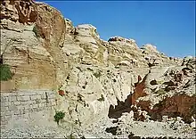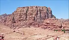 La arquitectura nabatea (en árabe: اَلْعِمَارَةُ النَّبَطِيَّةُ, romanizado: al-ʿimarah al-nabatiyyah), se refiere a las tradiciones de construcción de los nabateos (/ˌnæbəˈtiːənz/; nabataeo araméico: 𐢕𐢃𐢋𐢈 Nabāṭū; en árabe: ٱلْأَنْبَاط , al-ʾAnbāṭ; comparar con acadio: 𒈾𒁀𒌅 Nabātu; en griego antiguo: Ναβαταῖος; en latín: Nabataeus), un antiguo pueblo árabe que habitó el norte de Arabia y el Levante meridional.[1][2][3][4][5][6][7] Sus asentamientos, principalmente la supuesta ciudad capital de Raqmu (actual Petra, Jordania), dieron el nombre de Nabatene (en griego antiguo: Ναβατηνή, Nabatēnḗ) a la frontera árabe que se extendía desde el Éufrates hasta el mar Rojo. Su producción arquitectónica es notable por sus templos y tumbas, siendo las más famosas las que se encuentran en Petra. El estilo parece ser una mezcla de influencias mesopotámicas, fenicias y helenísticas modificadas para adaptarse al gusto arquitectónico árabe.[8][9] Petra, la capital del reino de Nabatea, es tan famosa ahora como lo fue en la antigüedad por sus notables tumbas y templos excavados en la roca. La mayoría de los restos arquitectónicos nabateos, que datan del siglo I a. C. al siglo II d. C., son muy visibles y están bien conservados, con más de 500 monumentos en Petra, en la actual Jordania, y 110 tumbas bien conservadas ubicadas en el paisaje desértico de Hegra, ahora en la actual Arabia Saudita.[10][11] Gran parte de la arquitectura sobreviviente fue tallada en acantilados rocosos, por lo que las columnas en realidad no soportan nada, sino que se utilizan con fines puramente ornamentales.[12] Además de los sitios más famosos de Petra, también hay complejos nabateos en Obodas (Avdat) y complejos residenciales en Mampsis (Kurnub) y un sitio religioso de Jirbet et-Tannur.[13]