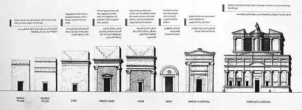 Las tumbas con fachadas detalladas también fueron bastante populares entre la comunidad nabatea. Hay un total de ocho tipos de fachadas diferentes[43] que ofrecen la oportunidad de comprender las diferentes tipologías estilísticas adoptadas por los nabateos: