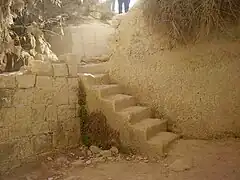También se usaron cuevas con fines residenciales. La zona residencial de Hegra se encuentra en medio de la llanura, lejos de los afloramientos.[32] El material principal de construcción de las casas y del muro que las encerraba era el ladrillo de adobe secado al sol.[32] Quedan pocos vestigios de la zona residencial.
