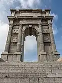 - ad arco, arqueada, la entrada a la puerta está rematada por un doble arco con un círculo central;