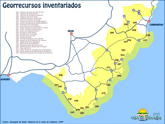 El Plan de Ordenación de los Recursos Naturales del parque natural Cabo de Gata-Níjar relaciona una serie de recursos geológicos que, sin estar incluidos en el Inventario de la Geodiversidad Andaluza, merecen ser objeto de programas de conservación y divulgación:[2]