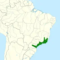 Se encuentra únicamente en el sureste de Brasil. Su hábitat natural son los bosques húmedos tropicales de tierras bajas,[1] aunque también vive en bosques degradados.