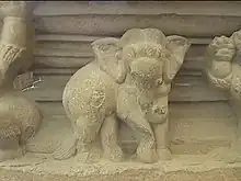 Guardián de arenisca dvarapala pisoteando a un toro, que a su vez vomita a un pequeño guerrero.