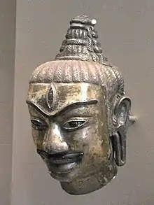 Esta figura sentada puede ser un dharmapala. El pedestal de abajo (no en la foto) presenta una imagen de una cabeza de Kaal (el tiempo.