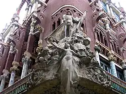 A finales de siglo se celebró un evento que supuso un gran impacto tanto económico y social como urbanístico, artístico y cultural para la ciudad, la Exposición Universal de 1888. Tuvo lugar entre el 8 de abril y el 9 de diciembre de 1888, y se llevó a cabo en el parque de la Ciudadela, anteriormente perteneciente al ejército y ganado para la ciudad en 1868. El incentivo de los actos feriales conllevó la mejora de las infraestructuras de toda la ciudad, que dio un enorme salto hacia la modernización y el desarrollo.[28] Asimismo, supuso el banco de pruebas de un nuevo estilo artístico, el modernismo, que hasta principios del siglo XX fue el que imperó a nivel arquitectónico y artístico en la ciudad, y convirtió a la Barcelona modernista, junto con la gótica, en el estilo más definitorio de la Ciudad Condal.[29] La estatuaria realizada para la Exposición fue la aportación más importante al arte público de la ciudad en toda su historia, y coincidió con una generación de escultores de gran talla que propició uno de los momentos más brillantes de la historia del arte catalán.[30]