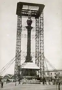 Fuera de los terrenos de la Exposición también se erigieron diversos monumentos y obras de estatuaria, entre los que destaca el Monumento a Colón, situado en la plaza del Portal de la Paz, punto de unión entre las Ramblas y el paseo de Colón, frente al puerto viejo de Barcelona. Construido en homenaje al descubridor Cristóbal Colón, fue inaugurado el 1 de junio de 1888. El monumento fue concebido por Cayetano Buigas, y mide un total de 60 metros de altura. La estatua de Colón está situada en lo alto de una columna de hierro, y es una obra en bronce del escultor Rafael Atché, de siete metros de altura. El monumento se divide en tres cuerpos: una base circular, con cuatro tramos de escalera de 6 metros de ancho, con ocho estatuas de leones y ocho bajorrelieves con los escudos de las provincias españolas y los principales actos realizados por Colón; un polígono de ocho lados, cuatro de ellos dispuestos como contrafuertes, en forma de cruz, con estatuas alegóricas de Cataluña, Aragón, Castilla y León, así como de las figuras de Bernardo Boyl, Pedro de Margarit, Jaume Ferrer de Blanes y Luis de Santángel; la columna de orden corintio, con una base con figuras de carabelas, grifos y Famas aladas, el capitel con representaciones de Europa, África, Asia y América, una corona de príncipe, una semiesfera —por la parte recién descubierta del globo terráqueo— y la estatua de Colón. El conjunto escultórico fue adjudicado mediante concurso público a diversos talleres y escultores: Josep Llimona (bajorrelieves), Antoni Vilanova (bajorrelieves), Rossend Nobas (contrafuertes), Francesc Pastor (capitel), Pere Carbonell (Cataluña), Josep Carcassó (Aragón, leones heráldicos), Josep Gamot (Castilla, Luis de Santángel), Rafael Atché (León, estatua de Colón), Manuel Fuxá (Padre Boyl), Francisco Pagés Serratosa (Jaume Ferrer de Blanes) y Eduard B. Alentorn (Pedro de Margarit). Con el tiempo, el de Colón se ha convertido en uno de los monumentos más emblemáticos de la ciudad.[38]