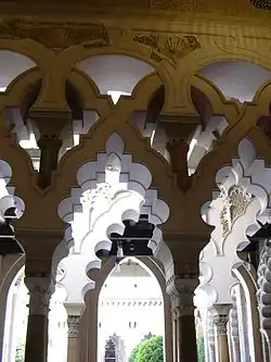 A esta misma tradición responde el repertorio de arcos desplegado en el edificio, encontrando desde arcos lobulados, mixtilíneos, de herradura semicircular y apuntada a complejas organizaciones de arcos entrecruzados, superpuestos y contrapuestos. Todos ellos realizados con materiales de escaso costo pero revestidos de yeserías con motivos vegetales, geométricos y epigráficos buscando un efecto de fastuosidad y aparente riqueza.