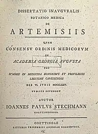 Dissertatio inauguralis botanico medica de Artemisiis (abreviado Artemis.)[1] es un libro con ilustraciones y descripciones botánicas que fue escrito por Johannes Paul Stechmann en latín y publicado en Gotinga en el año 1775 en Gotinga con el título Dissertatio inauguralis botanico medica de Artemisiis. Quam consensu ordinis medicorum in Academia Georgia Augusta pro summis in medicina honoribus ev privilegiis legitime capessendis die vi. ivnii mdcclxxv